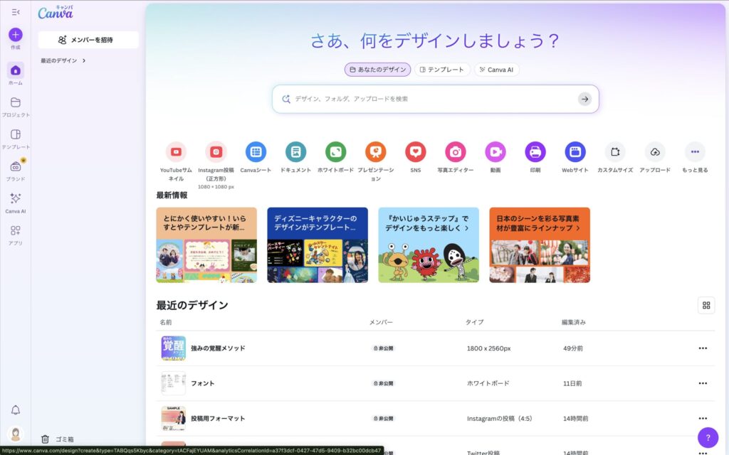 4.アカウントの登録が済むとCanvaのホーム画面へ。ここからデザインを制作していきます。