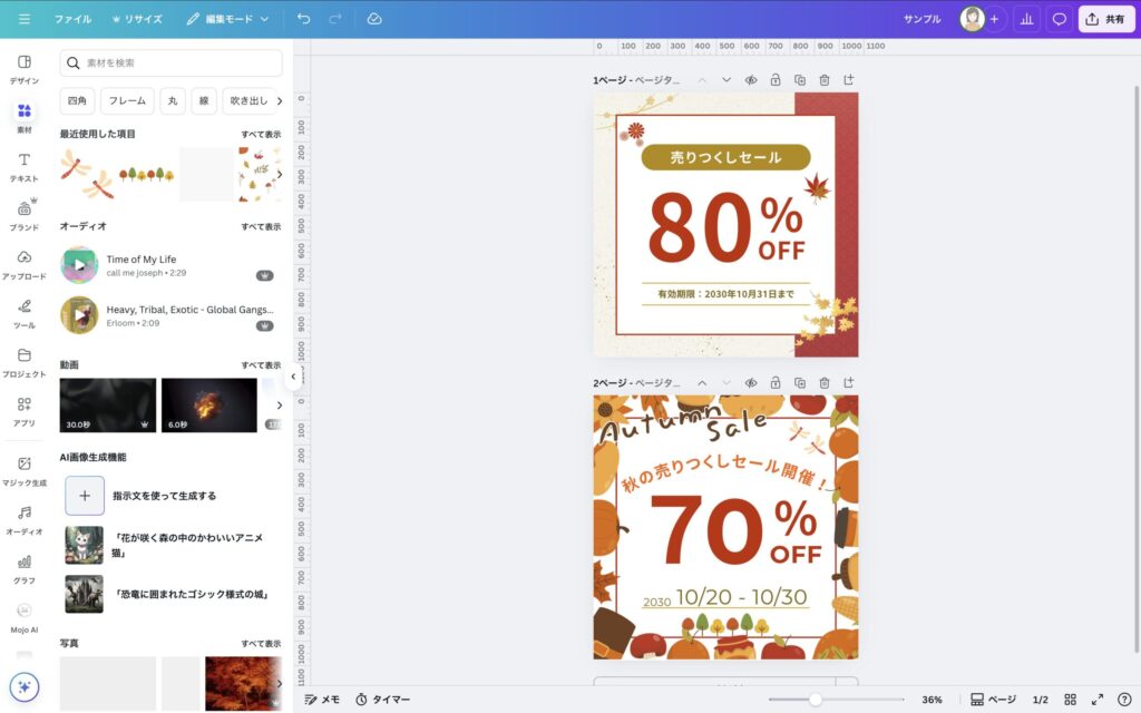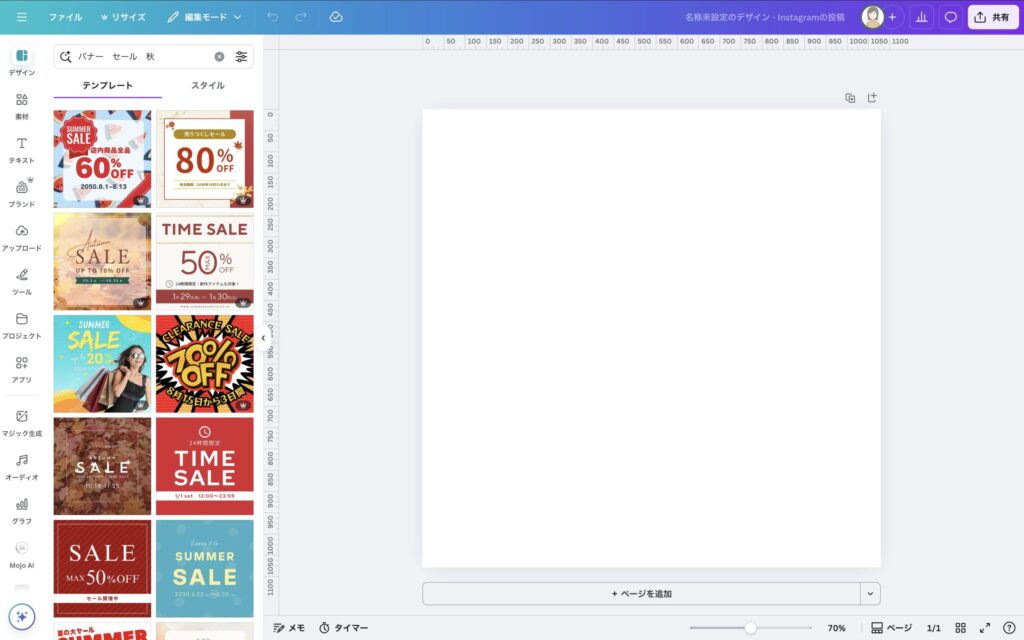 検索窓で作りたいデザインのイメージを入力します。今回は「バナー セール 秋」と入力、検索します。すると検索に応じたデザインテンプレートがずらりと表示されました!この中から使いたいデザインを選択します。
