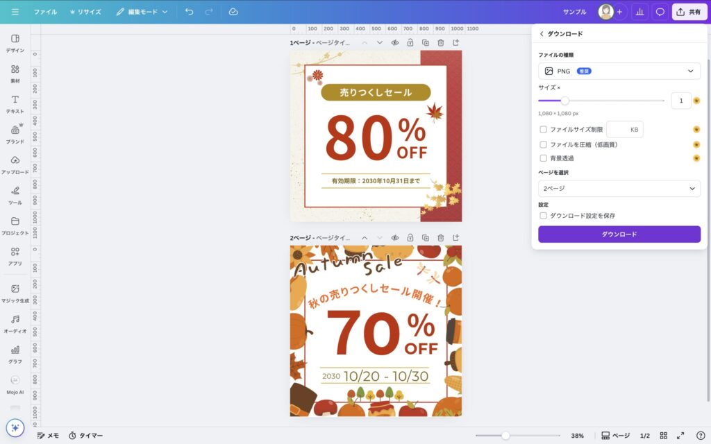 ファイルの種類(PNGやJPEGなど)を選び、ダウンロードしたいページを選択。今回は2枚目のデザインをダウンロードするので2ページ目を選択します。その後「ダウンロード」をクリック。無事ダウンロードできました!